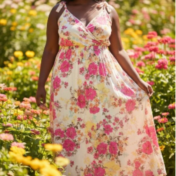 Floral print maxi dress featuring a sleeveless design with a wrap-style bodice and flowy full-length dress