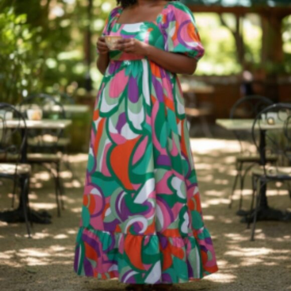 Multicolor printed maxi dress featuring short puff sleeves and a relaxed, flowy silhouette with a ruffled hem