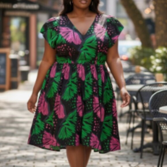 Green and pink printed dress featuring short flutter sleeves, a V-neckline, and a fitted waist with a flowy skirt