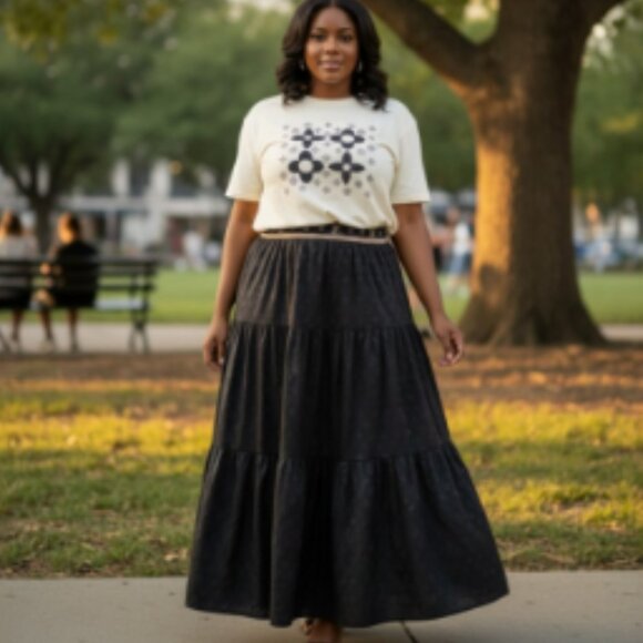The white shirt features stylish black and silver detailing, while the solid black skirt is adorned with a subtle LV print across the fabric