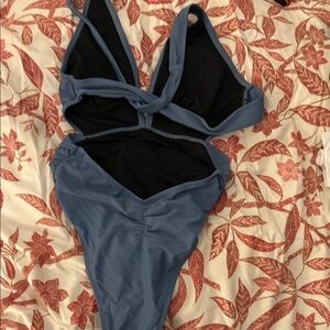 Stylish blue one-piece swimsuit with a unique front twist design. Perfect for beach days.
