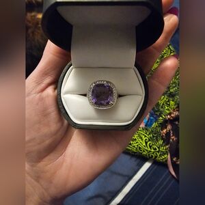 cushion cut halo amethyst in sterling silver. bought almost 20 years ago from Gordon's Jewelers. I don't know if the Amethyst is genuine or Lab created but after all these years still looks beautiful. the smaller stones are white sapphires (not diamonds) it's a size 6.