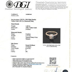 Cushion Diamond Engagement Ring Rose Cut 14K Yellow Gold Fancy Gray 1.85 TCW