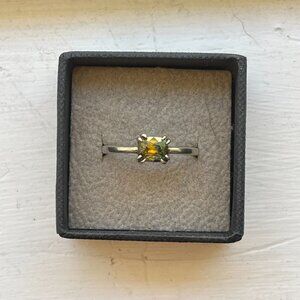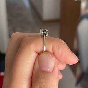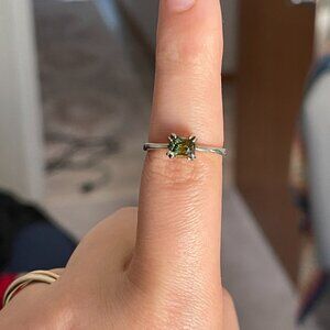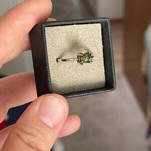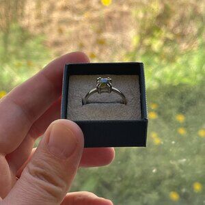 The stone weighs a little over a carat. It's set in sterling silver and is currently a size 7.
