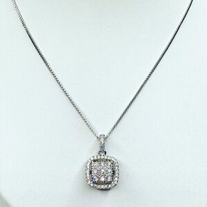 This necklace features small cushion-cut stones that are framed by a halo of sparkling accents. The pendant hangs gracefully from a silver-toned chain, offering a sophisticated touch to any ensemble.