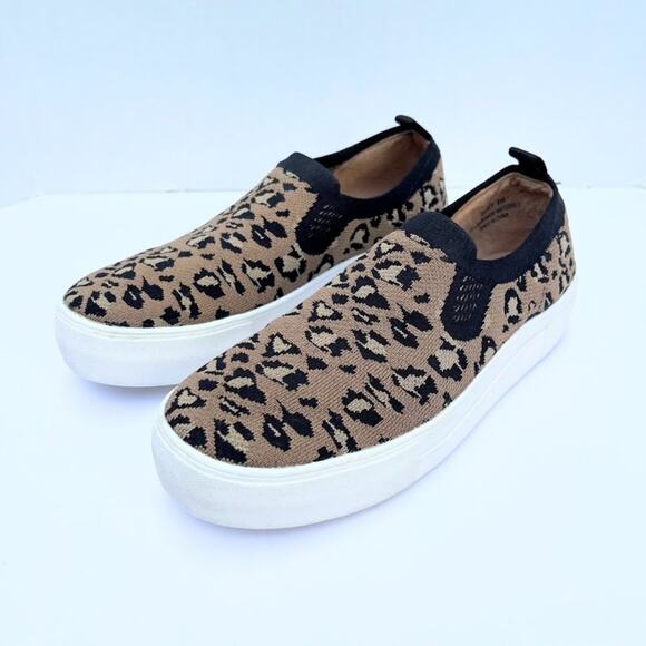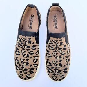 Cushionaire Rory knit slip-on sneakers. Leopard print fabric knit uppers, memory foam insoles