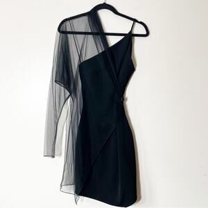 Keywords: Cushnie dress, black mini dress, single sleeve, asymmetrical, sheer tulle, mesh overlay, cocktail, party, date night, designer, neutral,