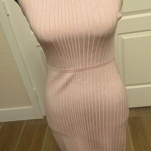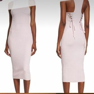 Cushnie et Ochs ribbed knit midi dress. Mock turtleneck; racerback. Sleeveless; cut-in shoulders. Lace-up back insets.