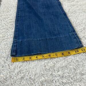 Designer denim with high waist and double button and zip closure. Buttons are silver, and embossed with the word Custo. Wide flared leg, with scoop front pockets and patch pockets in rear. No stretch, so double check measurements!