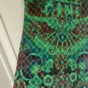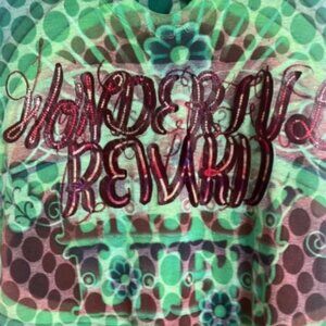 Unique semi sheer sleeveless top with vibrant green, blue and brown floral patterns. Appliqué lettering on the front says Wonderful Reward. Enjoy Life is worked into the pattern on the back. Top is nice and long and is perfect for an outing on a warm day. Size tag says 3 but it fits like a large.