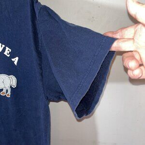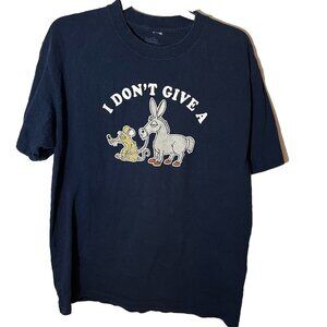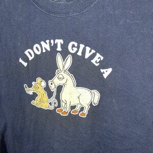 This is a blue T-shirt in size L with a crew neckline and a saying "I Don't Give A Rat A**" featuring a rat and a donkey graphic print. Made by Custom77, the shirt is made of 100% cotton and is collarless, with short sleeves and a regular fit. It is machine washable and suitable for all seasons. Perfect for unisex adults, this basic tee adds a touch of humor to your outfit.