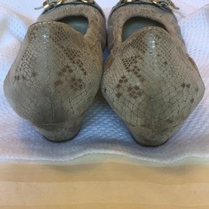 Custom AGL shoes, leathers and buckles hand-selected to create these classic shoes! Though gently used, there is slight scuff on left heel (see photo) and some discoloration on heels, otherwise great condition! Bronze/Beige in color with shimmer on heel and main part of shoe, patent leather bronze-silver color on toes. Perfect to pair with dress pants, skirts, dresses and even jeans🎈