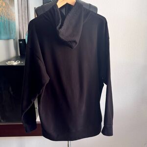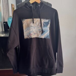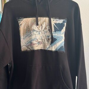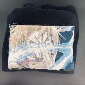 Unique custom black hoodie featuring an anime tapestry patch sewn on the chest.