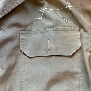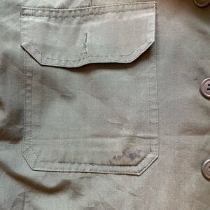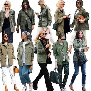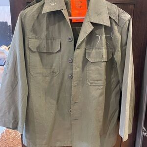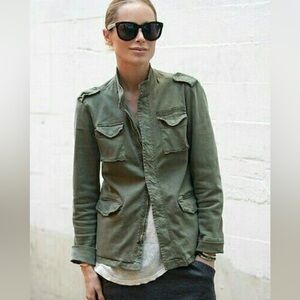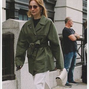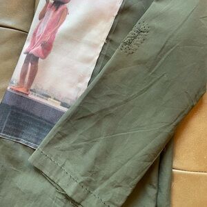 Custom edition vintage utility green jacket featuring back art piece appliqué. One of a kind jacket, can be worn up or down, with denim or on top of a sequin dress. Great with a belt too. See pictures for details. Can fit a woman S or M. see inspiration for styling