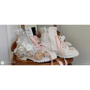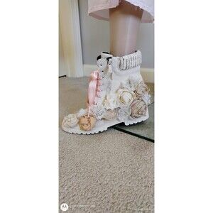 Step into fashion-forward territory with these funky upcycled boots! The creamy fleshtone color gives them a soft and versatile look, while the scuffed and tattered details add a touch of edgy flair. The shabby handmade roses and flowers on the sides bring a boho chic vibe thats perfect for any free spirit. With pink ribbon laces tying it all together, these boots are guaranteed to stand out in a crowd and add a touch of individuality to any outfit.