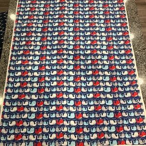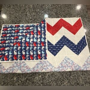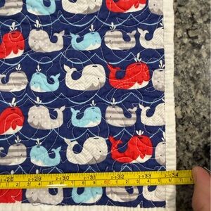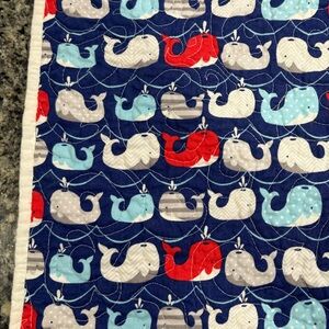 Custom handmade baby quilt with nautical theme. Used only for infant pictures and stored otherwise. Smoke free home. No holes or stains. Chevron stripes on front and whale print on back. Machine finished quilting.