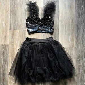 Custom designed dance costume 2 piece top with skirt. Top (stretchy) has metallic black band with mesh overlay, silver sequins and puffy tulle straps. Skirt has stretchy satin waistband & lining over-layed with 3 layers of black tulle. Original owners, great condition other than missing 1 crystal on the top.