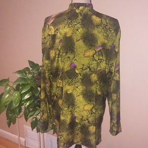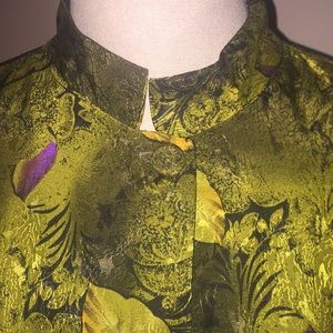 Chinese Mandarin-style collar. Blouse was custom made for me. Polyester, no size tag, Large. Appx measurements laying flat...shoulder 17”, pit 22”, length 33”, sleeve 25”. Slit on sleeves and sides, need a little stitch.