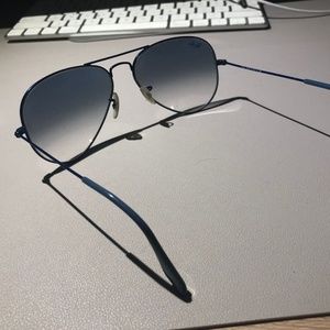 This is a pair of Ray-Ban aviator glasses with sparkly blue rimmed metal frames. The lenses have a blue-to-clear gradient fade. They also come with a case. Check the model name RB3025 Aviator Large Metal in the link below to compare the original manufacturer price to my listing.