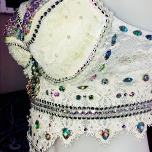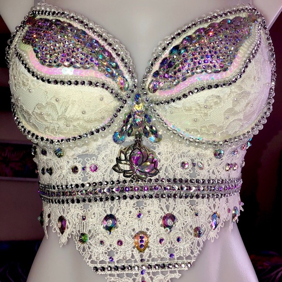 This bra is from ‘Kamala Collection’. It is Kamala’s signature bra. Made with real Swarovski. You may purchase this bra on 6 colors as well as decide white or black design. The bra shown is white on white. Made in any size!