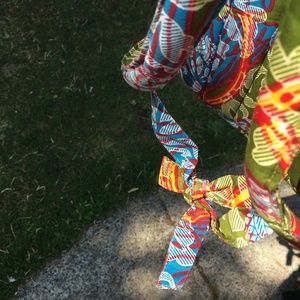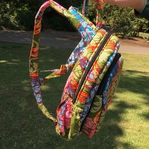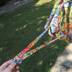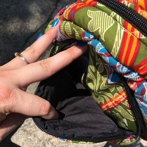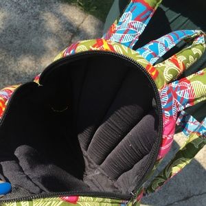Rainbow colors make up an abstract jungle pattern on this cushioned backpack for children. Very festive, and in new condition. This backpack is perfect for vacation, and comes with two straps to gently tie the backpack securely across the child's chest reducing the weight on their back. It would work well for daycare and preschool as well.