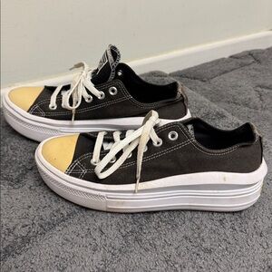 Custom Chuck Taylor Lift platform 8.5 Stylish Converse sneakers featuring a black canvas body. Distinctive yellow toe caps. Classic white laces and sole. (Slightly used condition very good ) sold as is