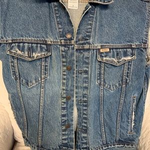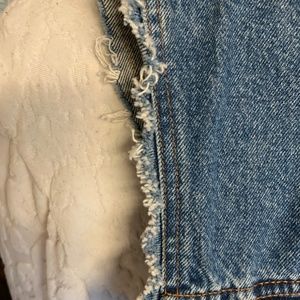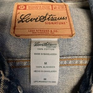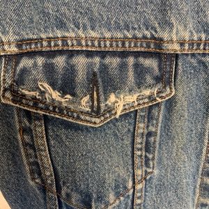 This is a custom made, one of a kind Levi's jeans jacket with a Cobra Kai patch on the back. I got the jacket plain, took the sleeves off and distressed it (that's the fraying you see on the sleeves and pockets) I special ordered the patch and attached it myself. It's nice and secure. No stains or anything on the jacket. Super clean!