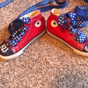 These will make that Kansas Jayhawk Fan super excited! Custom made from someone off Etsy for my toddler who couldn’t walk so never worn on the soles. Put ribbon in for the laces to dress them up and do jot have original laces. Some rhinestones have come off and will with wear I was informed but if you’re crafty like me I just bought some extras and glued them on when needed.