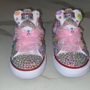 Custom mermaid Converse! Designed with AB Cotton Candy pearls, AB white pearls, AB Lavender pearls, AB Ocean Blue pearls, AB Sunshine pearls, with a hint of AB crystals! Shoe features soft pink and purple shells with stars and flower design!! Paired with soft pink ribbon laces! Can be customized according to choice of color! Allow 3 business days to create your masterpiece!!