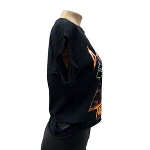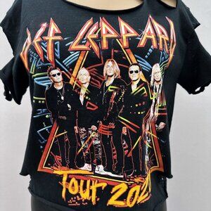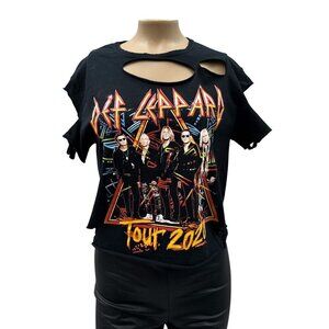 Tags: Def Leppard shirt, tour t-shirt, distressed t-shirt, graphic t-shirt, vintage style tee, rock concert tee, women's band shirt, cut-out shirt, casual wear shirt, short sleeve tee, Gildan cotton shirt, black band tee, music fan shirt