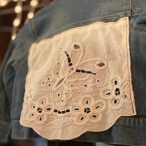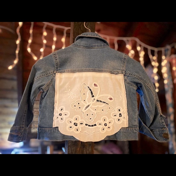 This is the sweetest Reworked Vintage 1980’s curtain, on a Carter’s denim jacket