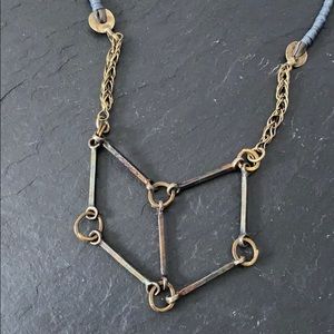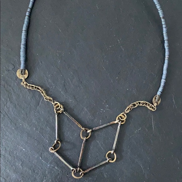 New custom piece by contemporary Turkish jewelry designer, Janset Bilgin. Made from a Uzbekistan chain, metals, and leather. The piece is about 23" long.