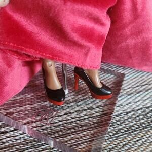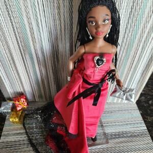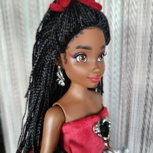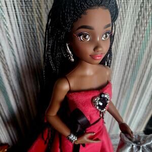 Custom Disney ily doll with dark skin, braun eyes, and vibrant red lips. Custom glitter highlight eyelashes. Dressed in a red velvet and lace layerd gown with detachable train, custom platform heels, silver black gemstone embroidery, jewelry and metalic clutch