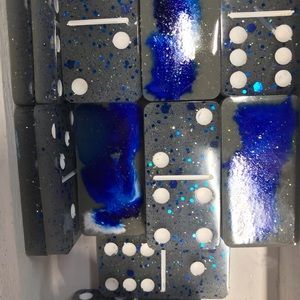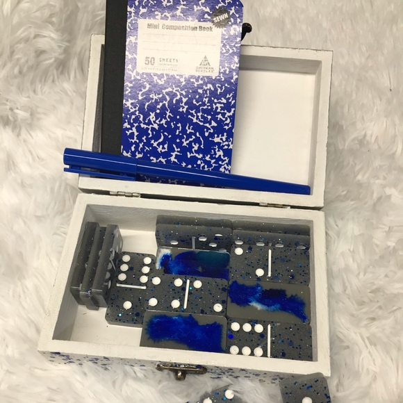 Handmade dominoes! 😍 Made out of resin, acrylic paint, glitter, and alcohol ink. Comes with wooden box, pen and notepad to match.