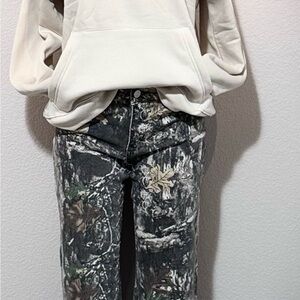 Stylish cream hoodie with 'Sweater Weather' text. Paired with camo pants sold separately!