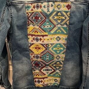 Back of Jack is beautifully embroidered. Metal buttons. 17” pit to pit. 26” length. Blue, white, turquoise and burgundy colored embroidered.