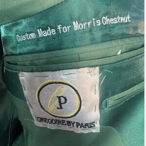 Step into Hollywood luxury with this one-of-a-kind emerald-green silk suit by Gregoire by Paris, meticulously tailored for acclaimed actor Morris Chestnut. This showstopping four-piece ensemble was discovered within the verified J. Bolin wardrobe archive and includes the custom jacket, trousers, and matching emerald silk tie.