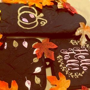 7x13 in Oven mitt with two 7.5x7.5 inch pot holders with custom distressed fall decals.