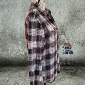 I have re-worked this black, gray and red vintage style pre-owned flannel, and bleach distressed to get that one-of-a-kind designed and lived-in look!