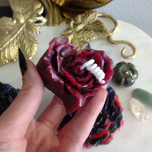 Experience the calming ambiance of Nocturnal Designs' 'Floral Decadence Beeswax Candle Gift Set'. Handcrafted w/ utmost care & precision, each set includes beautifully designed peony & heart shaped flower candles, accompanied w/ a pumpkin crystal, small size of our handpicked blend of witchy goth potpourri & a custom skull diffuser. Made from 100% beeswax, ecodyes & ethical mineral paint, these candles burn cleaner & longer than traditional paraffin candles, offering a sustainable & ethical choice for your candle needs. Burning candles in aesthetic shapes inherently leaves wax behind, so instead of throwing away the wax that remains, display items within the shell to create a unique piece of decor (see last image for inspo).