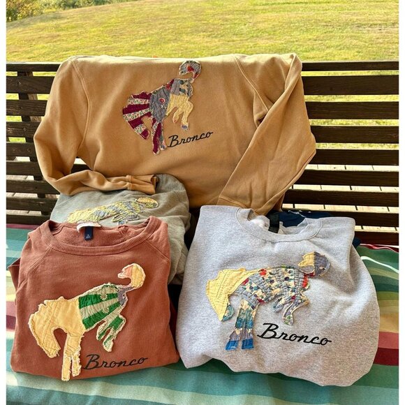 Vintage quilts are sourced locally and reclaimed and made into these beautiful sweatshirts with Ford Bronco outline. Each one is slightly unique depending on the fabric combinations. The largest point of each design measures approximately 10-11".