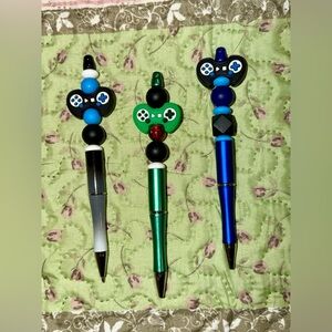 Set of three pens with game controller designs. Features black, green, and blue colors.