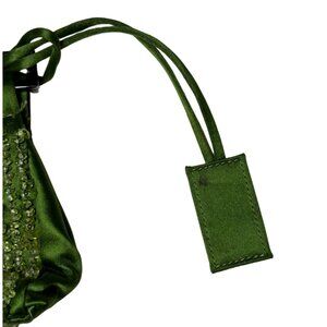 This is not your average Gucci clutch—this is a one-of-one, custom-made piece created for an award show red carpet look in the early 2000s. Crafted in rich green silk and hand-beaded with clear green stone beads, it’s a miniature masterpiece of couture-level detailing. The silver-tone hardware is pristine, and the simple tie closure adds a delicate finish. Measuring just 8" × 4.5" × 0.5", it’s small in scale but monumental in rarity and craftsmanship. The interior features the original Gucci tag, subtly marked with a faint stain—an honest trace of its singular history.