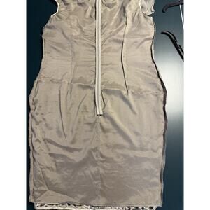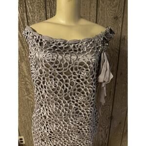 This custom hand-made dress in size large features a sleeveless design with an off-the-shoulder neckline and a zip closure. Made from a blend of polyester, spandex, nylon, rayon, and linen, the dress has glitter, beaded, and sequin accents for added flair. It is 34 inches in length and is perfect for party or formal occasions during the summer and spring seasons. The dress is lined and has a bodycon style, making it a stylish and elegant choice for any event.