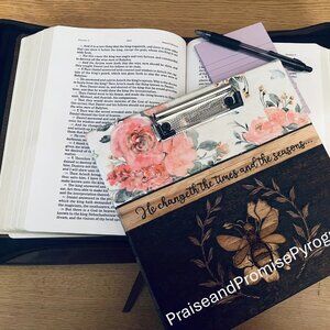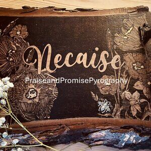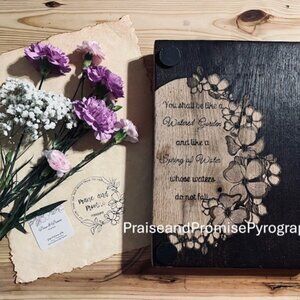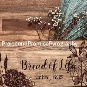 Custom, hand-burned decor. We make every order ourselves. My husband cuts most of the wood and the pieces are all hand-burned by me. I do not use any chemicals or lasers. Completion time depends on design and size and weight of board. They can be customized with favorite Scripture or name and do not have to have any embellishments added.