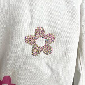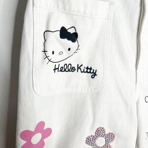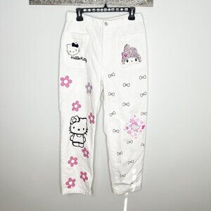 Adorable pair of custom made Hello Kitty Jeans. Made with a combination of paint, bling, patchwork, and heat transfer lettering. A truly one of a kind piece size 29. These have been purposfully distressed as well with small paint splatters and ditressed holes throughout.