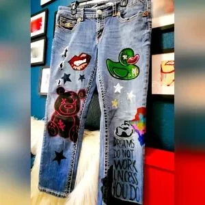 - Unique, handpainted artwork that transforms classic denim into a fashion statement