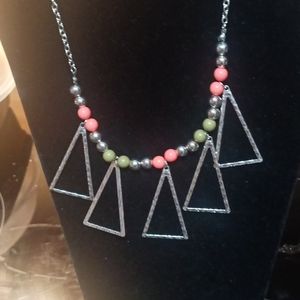 Silver chain necklace with silver triangle shape and pale orange and green beads with earrings on silver fish hooks
