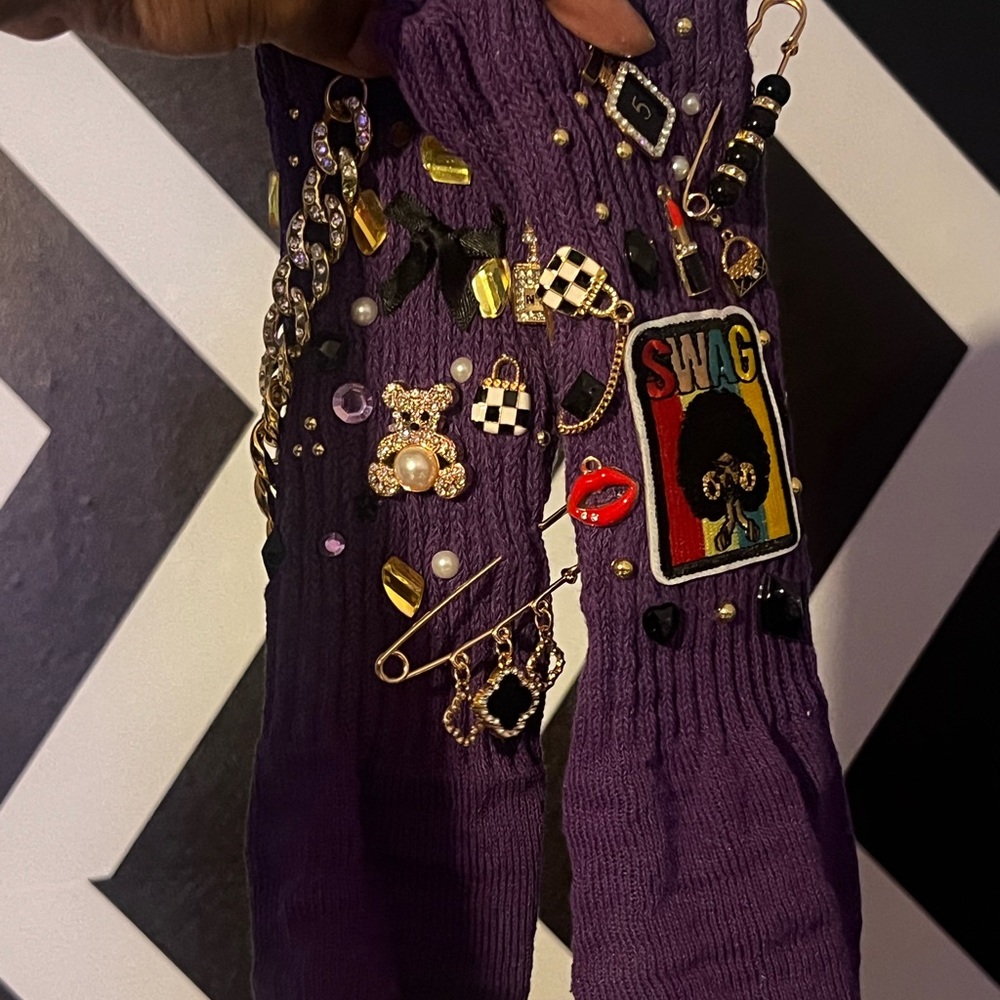 Stylish purple women's and kid’s hand made socks. Adorned with unique embellishments. Perfect for making a bold fashion statement.