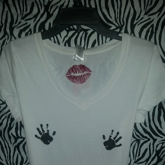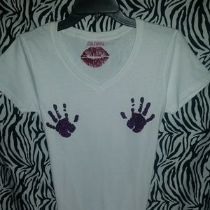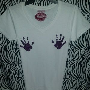 Ladies Tee shirt with v-neck. Lightweight cotton material. Glitter hands.